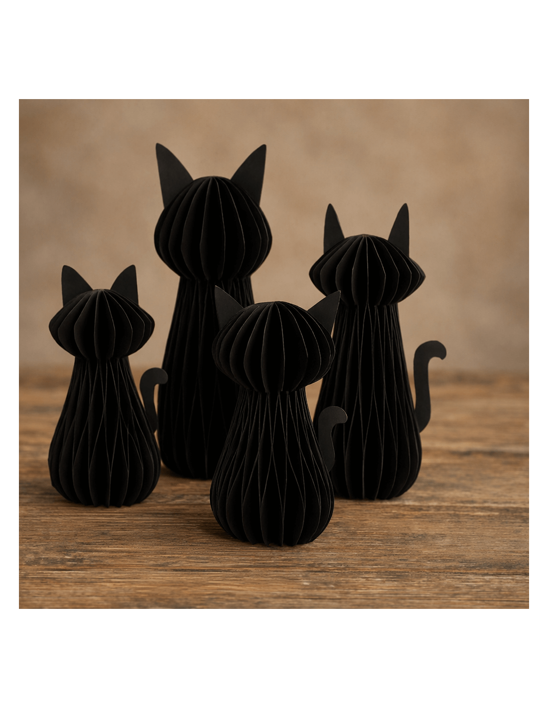 Pynt op til fastelavn med denne sorte fastelavnskat i honeycomb-papir på 25 cm. Den populære kat hører til enhver fastelavnsfest og giver en hyggelig og traditionel stemning sammen med tønden, serpentiner og masker. Katten er nem at folde ud til sin smukke 3D-form og kan både hænges op eller stå som bordpynt. Når festen er ovre, kan den let foldes sammen igen og genbruges næste år.