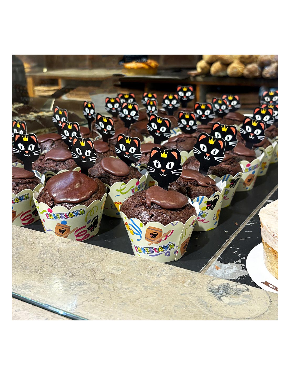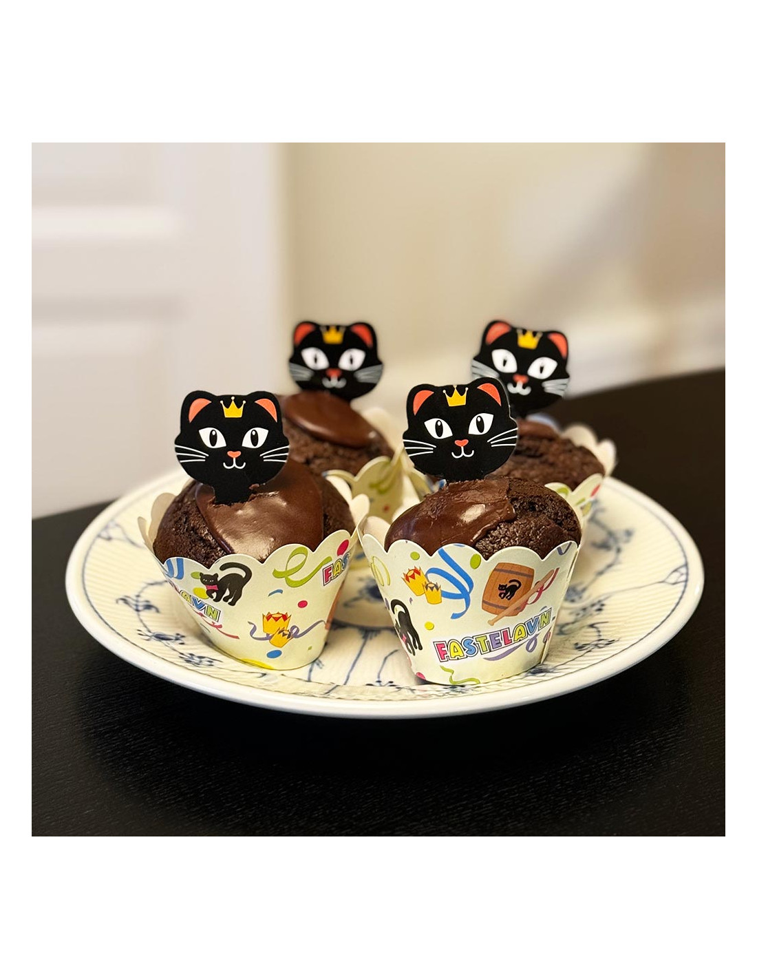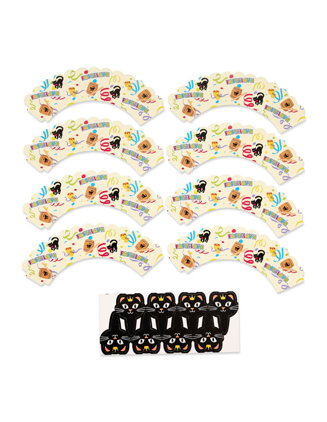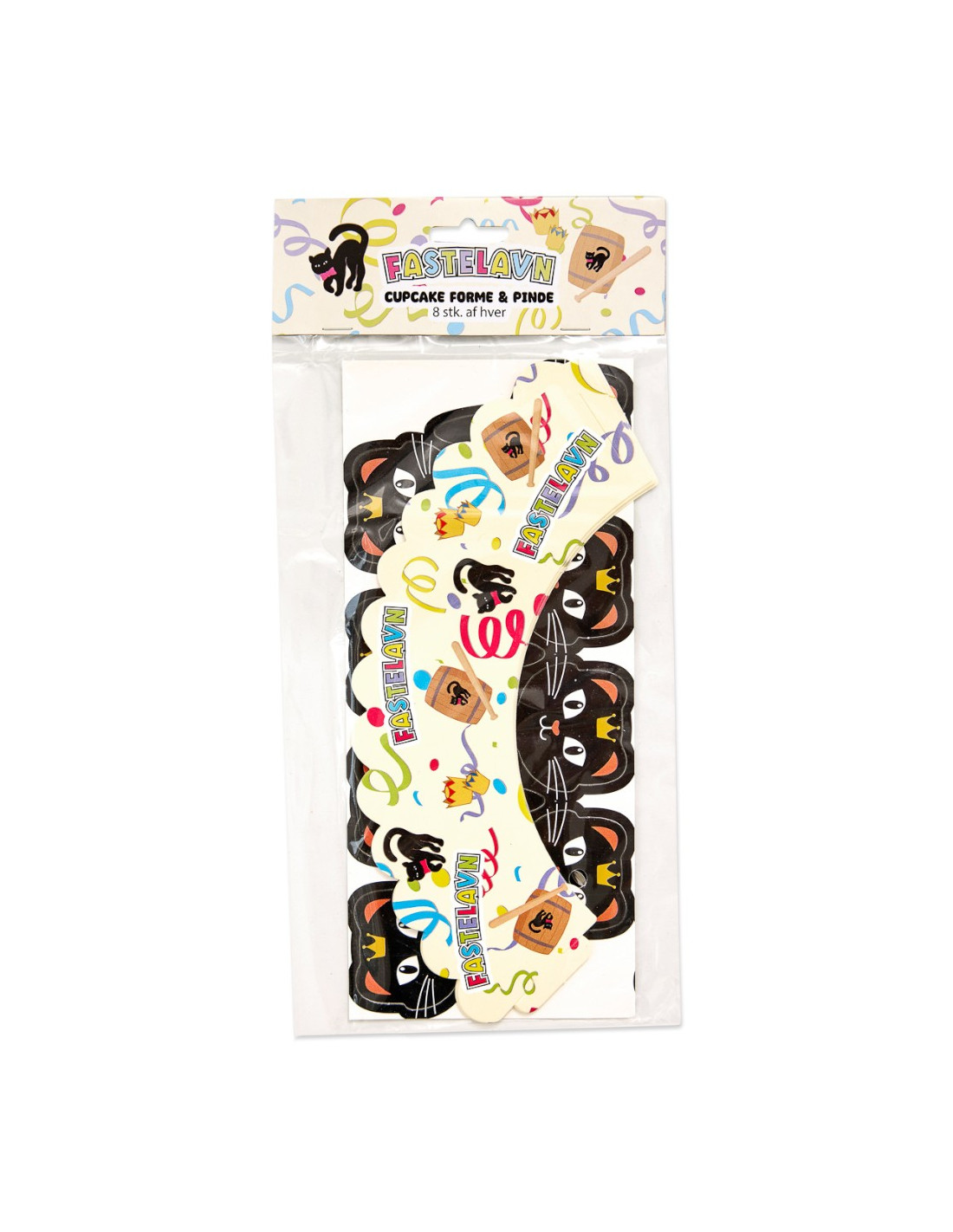 Gør kagebordet ekstra festligt med dette Fastelavn cupcake-sæt, der indeholder både formene og pyntesticks. Formene har et farverigt fastelavnstema med tønde, kat og serpentiner, mens pyntesticksene forestiller søde sorte katte med kroner.