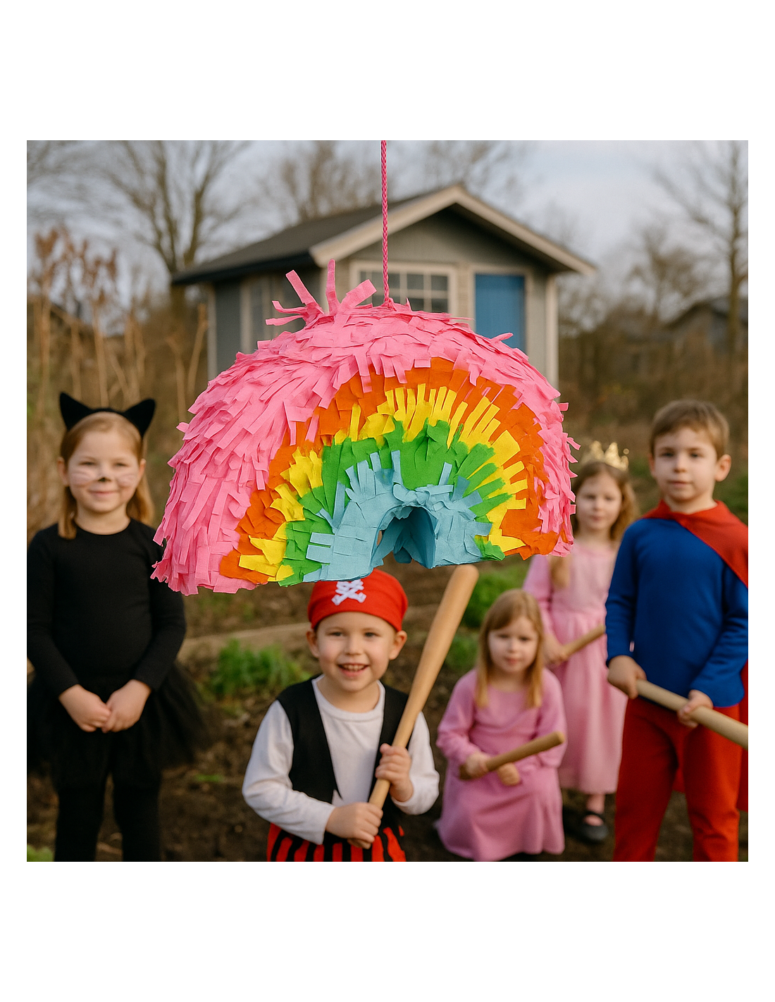 Gør fastelavnsfesten ekstra festlig med denne regnbueformede piñata i flotte farver! Piñataen bringer smil og latter til enhver fest, når børnene på skift prøver at slå den i stykker for at få fat i de lækre godter indeni. Den er lavet af farverigt papir og let pap, og kan hænges op med snor. Fyld den med slik, små legeting eller konfetti og lad festen begynde!