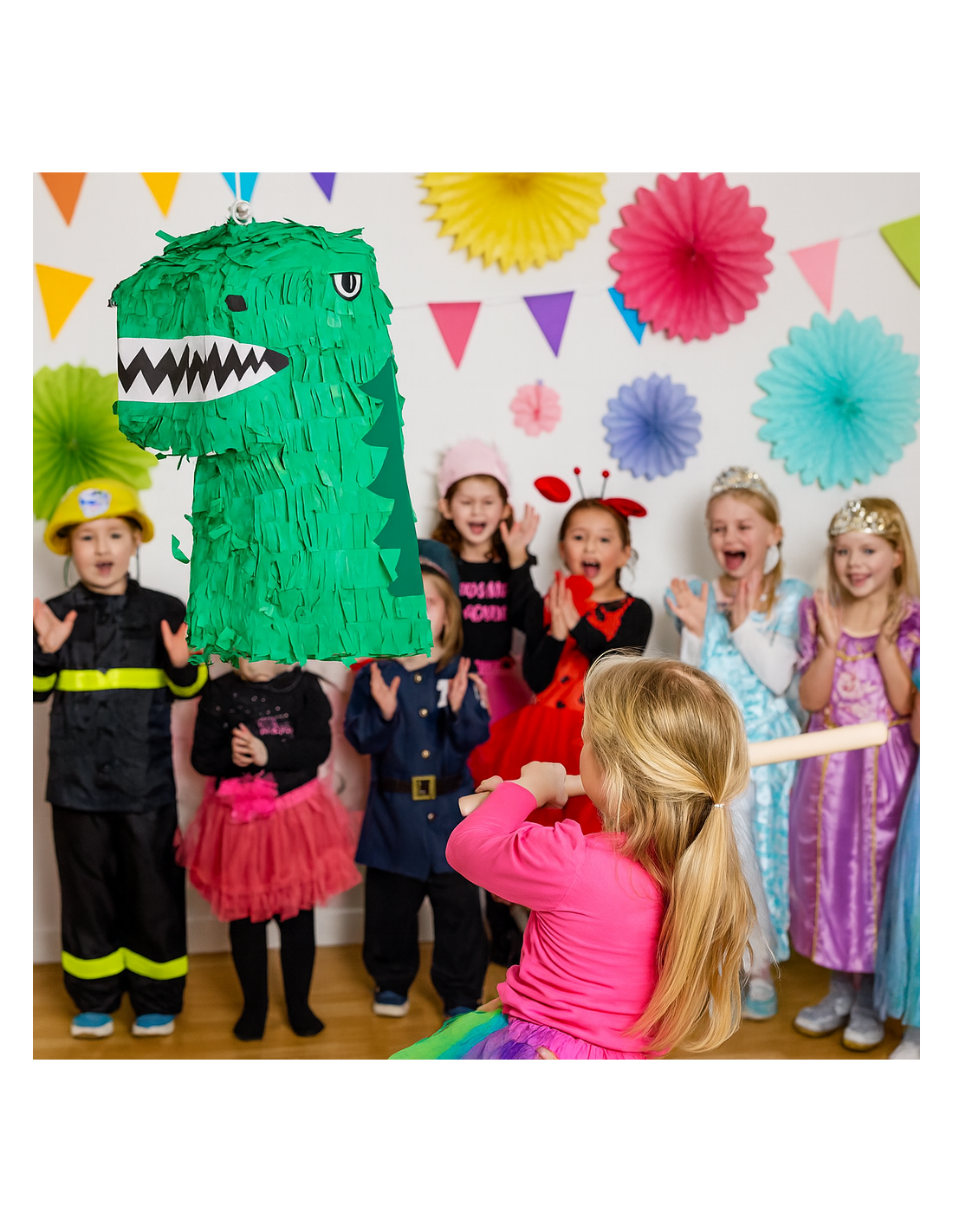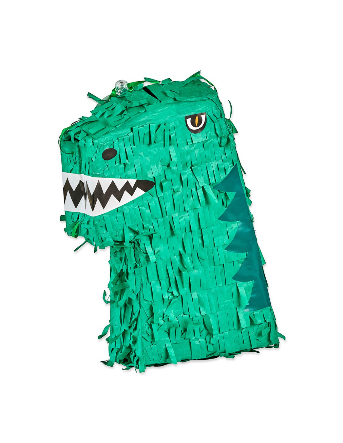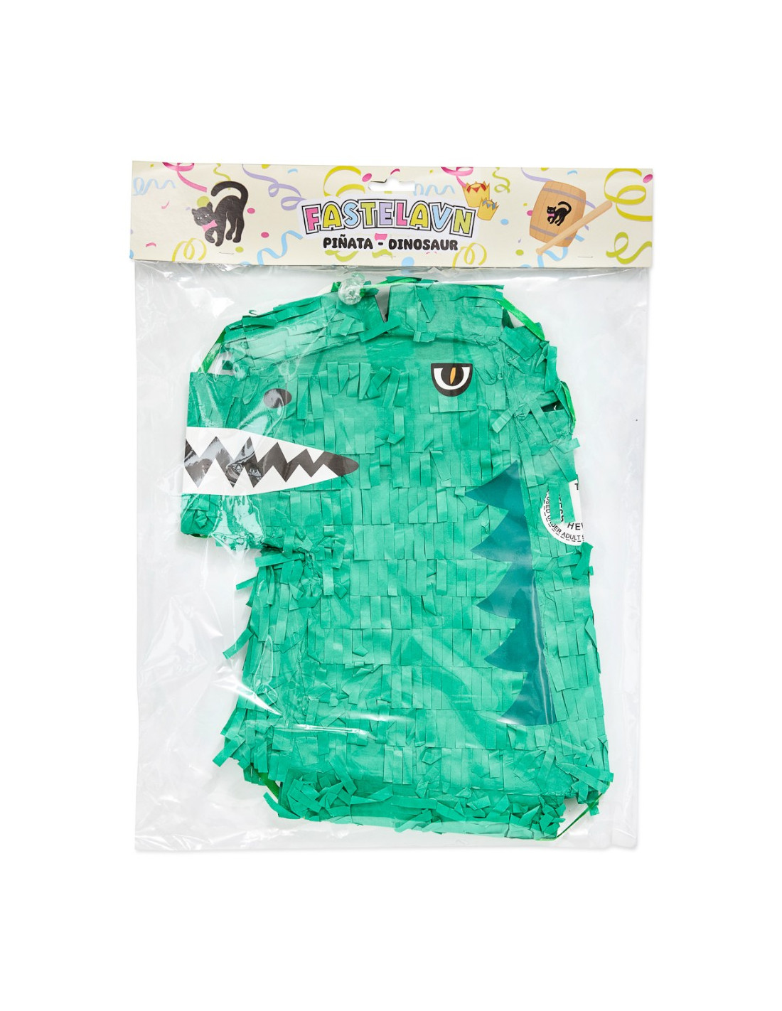 Bring ekstra sjov til fastelavn med denne dinosaur piñata! Den grønne dinosaur med skarpe tænder og glimt i øjet er klar til at blive slået i stykker til stor begejstring for børnene. Fyld piñataen med slik, små overraskelser eller konfetti, hæng den op, og lad legen begynde. Den er lavet i farverigt papir og pap, som giver den klassiske piñata-fornemmelse.