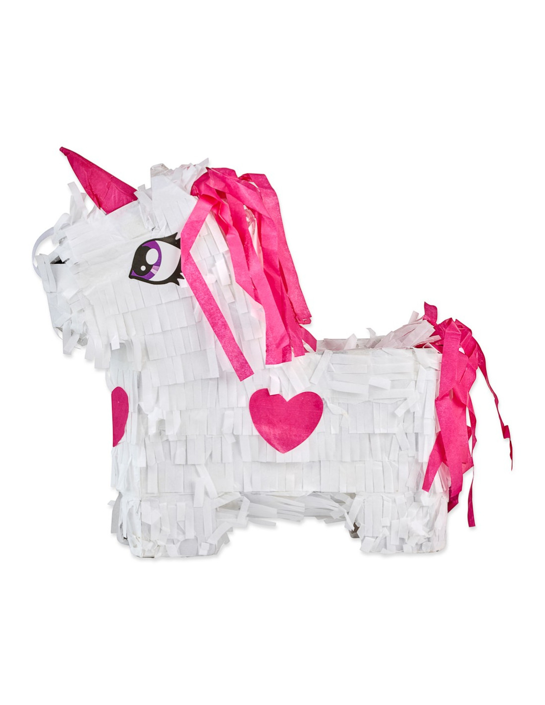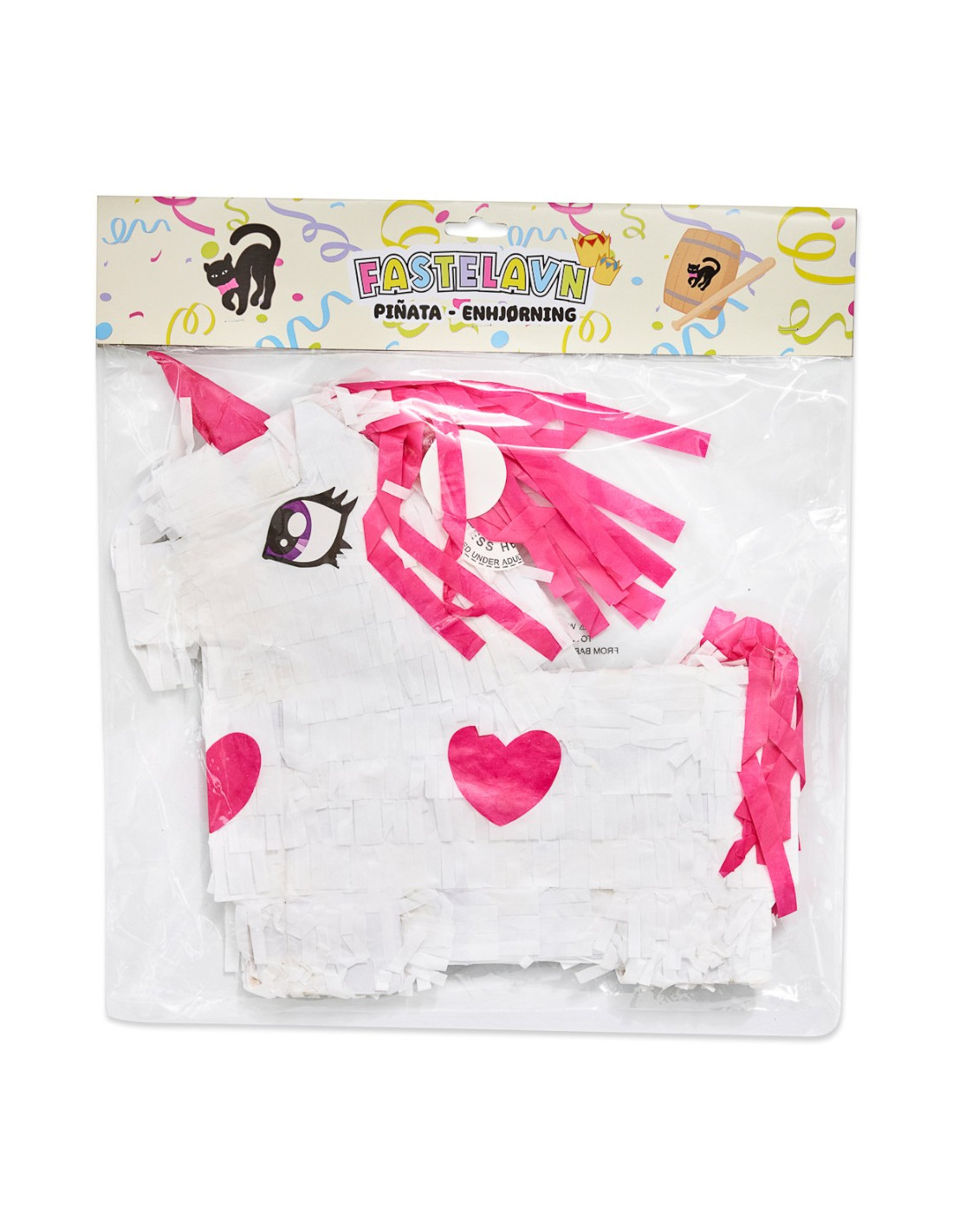 Skab magi til fastelavnsfesten med denne enhjørning piñata i hvid og pink. Den nuttede enhjørning med hjerter på siden og farverigt hår er klar til at blive slået i stykker for at afsløre de lækre godter indeni. Fyld den med slik, små gaver eller konfetti, og hæng den op til stor begejstring for børnene.